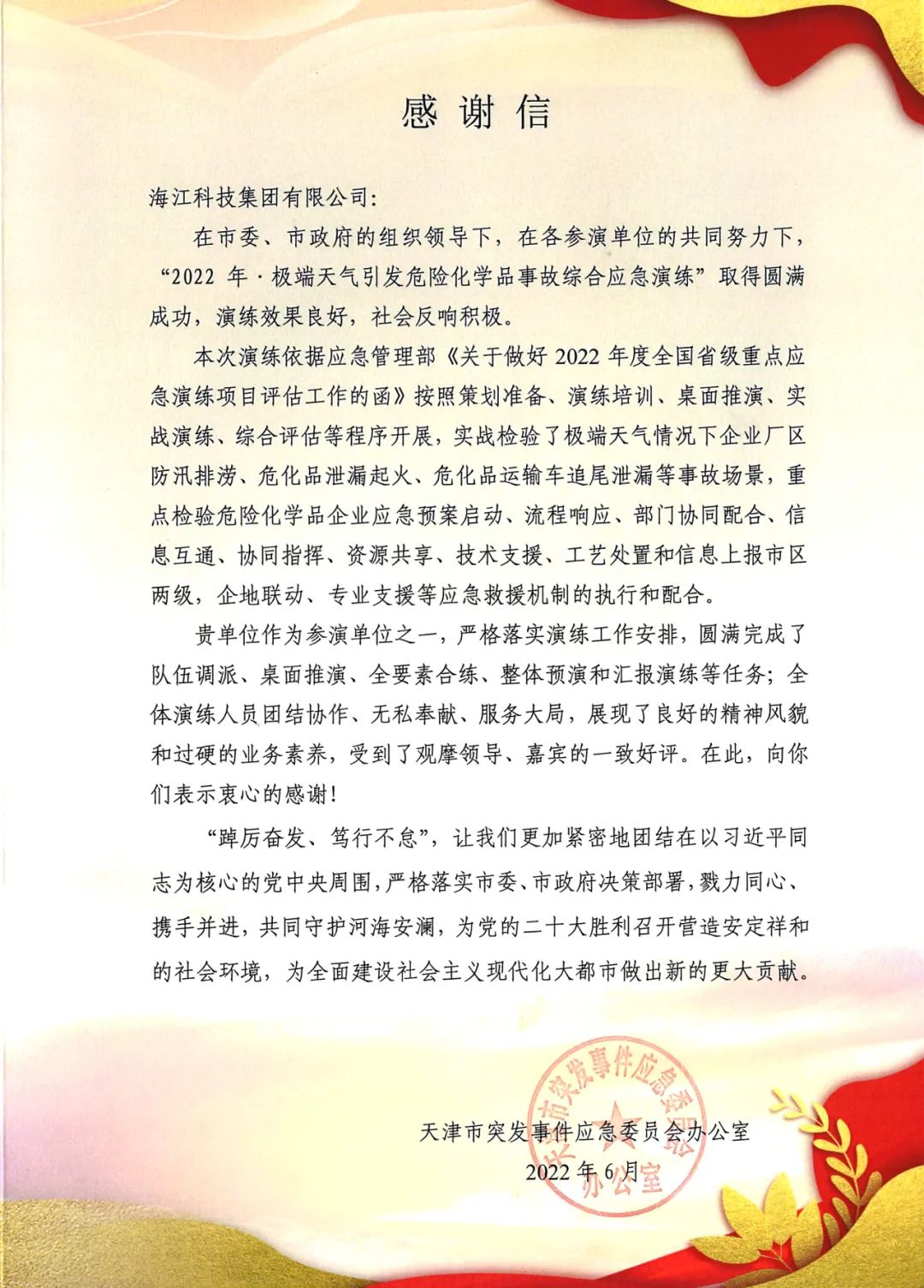 ? ? 近日,集團(tuán)收到一封來自天津市突發(fā)事件應(yīng)急委員會(huì)辦公室發(fā)來的感謝信及《2022年·極端天氣引發(fā)危險(xiǎn)化學(xué)品事故綜合應(yīng)急演練》突出貢獻(xiàn)榮譽(yù)獎(jiǎng)杯。