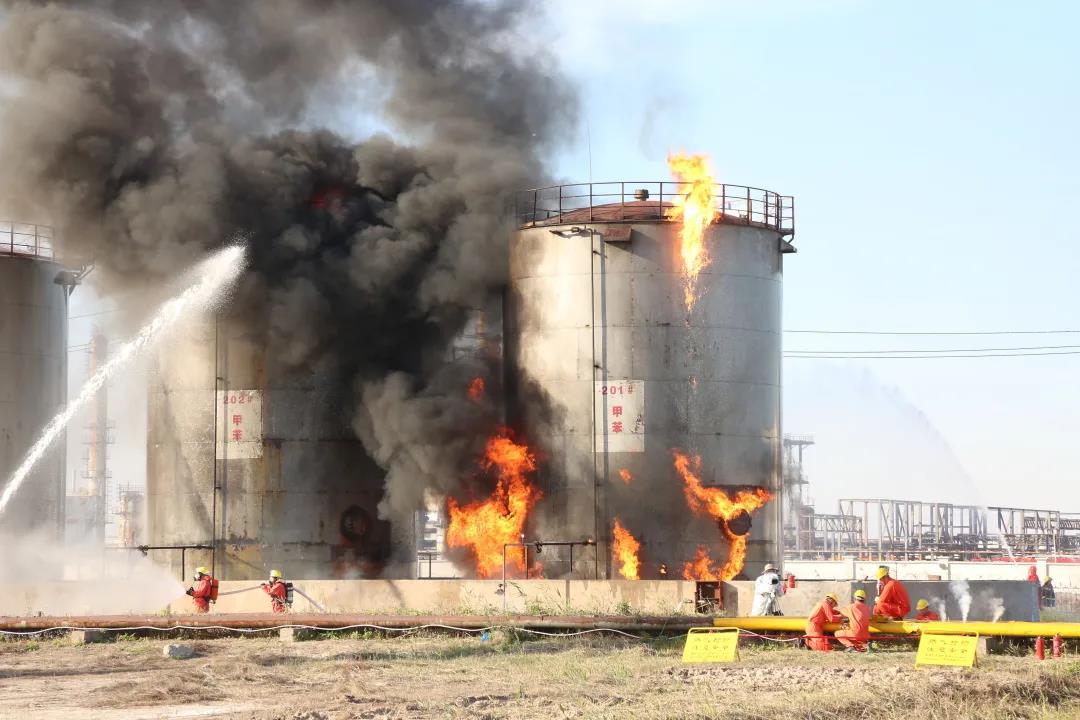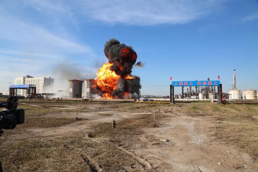 現(xiàn)場(chǎng)演練模擬天津港區(qū)危險(xiǎn)化學(xué)品企業(yè)生產(chǎn)設(shè)施和危化品儲(chǔ)罐遭受外力破壞發(fā)生特別重大?;贩磻?yīng)釜、油罐、倉(cāng)儲(chǔ)庫(kù)、輸油管線、運(yùn)輸車等連環(huán)燃燒和多次爆炸事故,造成甲苯、汽柴油、石腦油、LPG、氯乙烯、液氨等多種?;沸孤瑥S區(qū)5公里范圍內(nèi)的化工企業(yè)、居民區(qū),水電燃?xì)?、通信、交通等城市生命線遭到嚴(yán)重破壞。同時(shí)二次爆炸,又造成數(shù)公里內(nèi)房屋玻璃被震碎,沖擊波導(dǎo)致附近2條供水管線、3個(gè)架空變壓器、1座箱式變電站、1座通信中繼站、2座通信基站損毀,17個(gè)通信基站斷電。