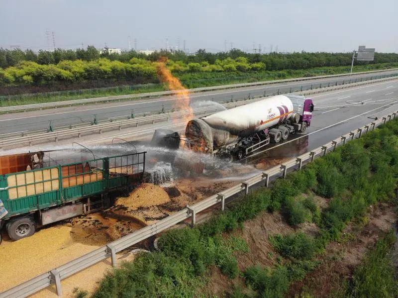 ? ? ? ? 8月3日下午1點(diǎn)49分,位于天津市濱海新區(qū)秦濱高速紅旗路互通立交附近處一輛液化氣槽車(chē)因碰撞發(fā)生泄漏起火事故,現(xiàn)場(chǎng)無(wú)人員傷亡。海江集團(tuán)救援隊(duì)接到任務(wù)后迅速趕赴現(xiàn)場(chǎng)配合各部門(mén)進(jìn)行處置。