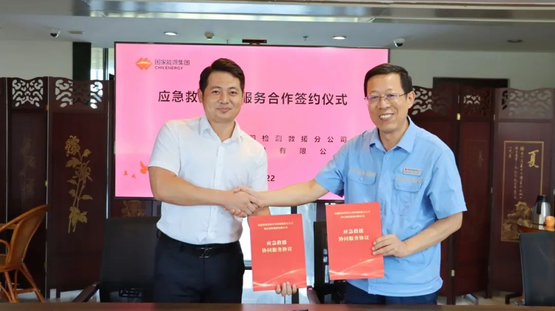 ? ? ? ?國能朔黃鐵路公司國能朔黃公司檢測救援分公司黨委書記、經(jīng)理秦懷兵、黨委委員副經(jīng)理張樹珍、安監(jiān)室主任李樹昆、救援隊(duì)長趙磊,以及海江集團(tuán)總經(jīng)理褚龍、企管部經(jīng)理謝中慧、企管部副經(jīng)理徐敏、應(yīng)急救援隊(duì)隊(duì)長王鵬等人出席本次簽約儀式。