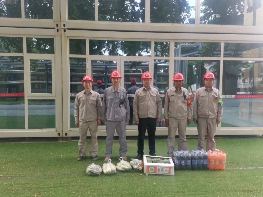 ? ? ? ?在廣州黃埔電廠項目部,海江集團總經理褚龍和工程部經理竇曉等公司高層領導巡視現場檢查安全隱患并為項目部員工們送上了一份清涼。