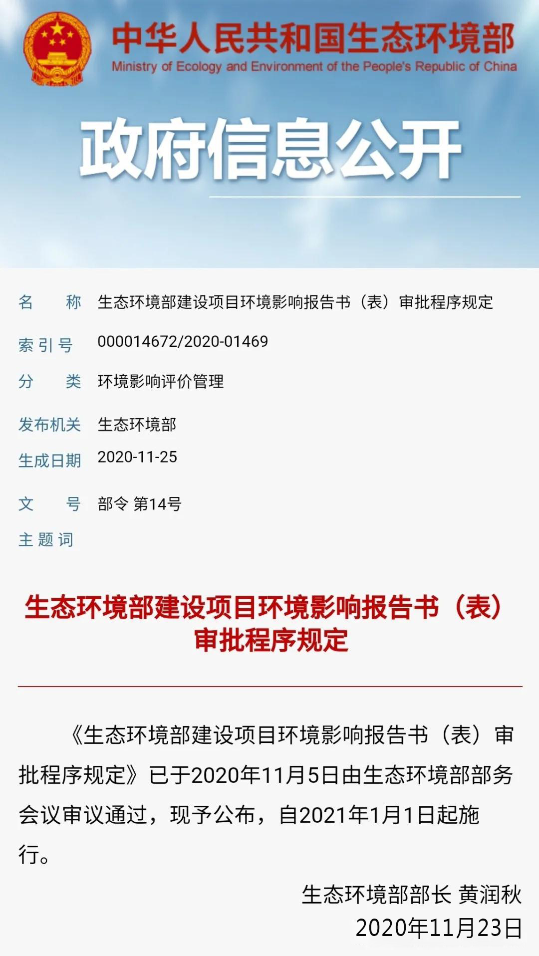 生態(tài)環(huán)境部:《生態(tài)環(huán)境部建設(shè)項目環(huán)境影響報告書(表)審批程序規(guī)定》正式