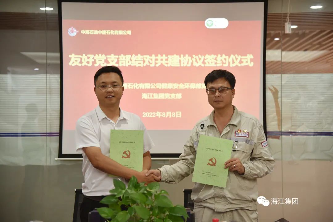 為進(jìn)一步提升黨建工作活力,以黨建引領(lǐng)促安全生產(chǎn),努力構(gòu)建“資源共享、優(yōu)勢(shì)互補(bǔ)、互相促進(jìn)、共同提高”的黨建工作新載體,8月8日,海江集團(tuán)黨支部與中海中捷石化健康安全環(huán)保部黨支部舉行友好黨支部結(jié)對(duì)共建協(xié)議簽約儀式。
