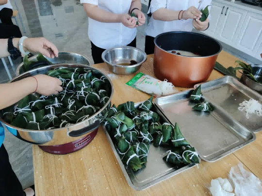 包粽子活動如約開始,大家提前將泡好的糯米、蜜棗、花生、粽葉等包粽子材料準(zhǔn)備好,員工們圍站在一起,相互配合,折葉、盛糯米、配料、包裹、扎繩,一氣呵成,玲瓏小巧的粽子紛紛亮相。整個活動現(xiàn)場,氣氛輕松融洽,不時傳來大家陣陣的歡笑聲。